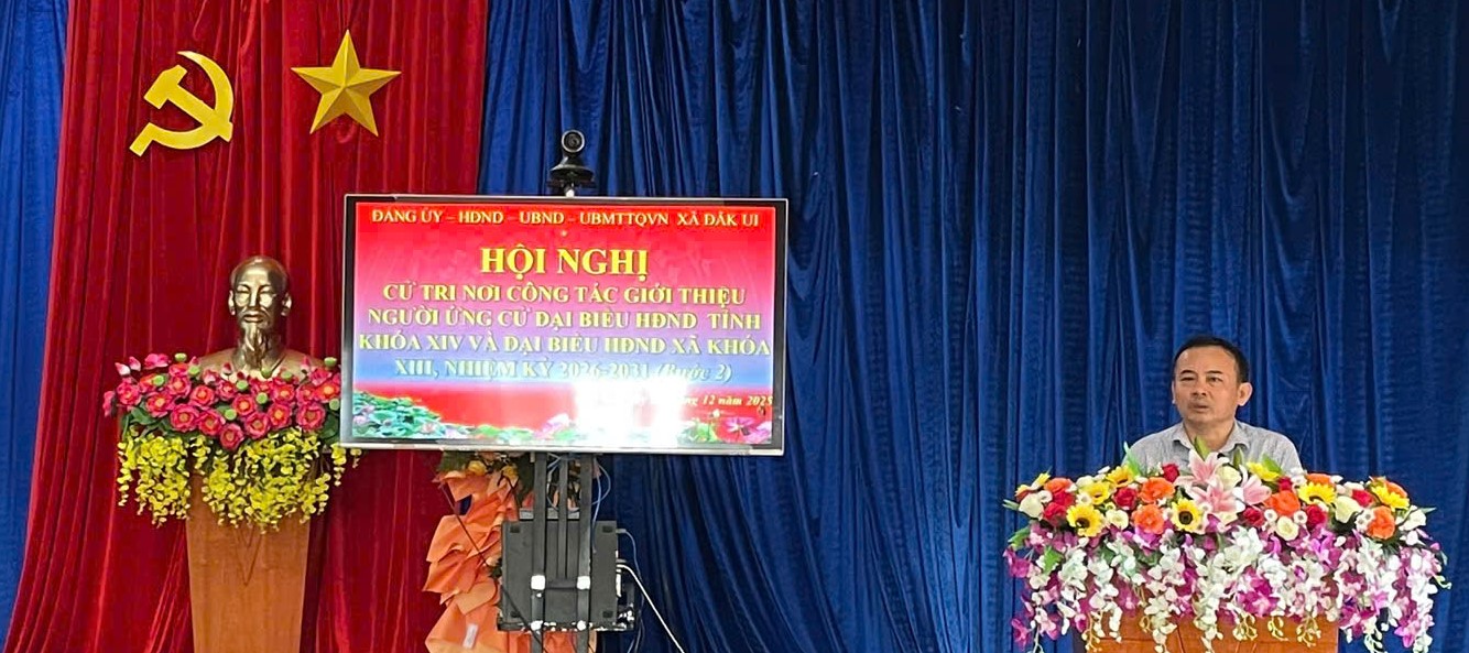 Thực hiện Luật Bầu cử đại biểu Quốc hội và đại biểu Hội đồng nhân dân; căn cứ kế hoạch và hướng dẫn của Ủy ban Mặt trận Tổ quốc Việt Nam các cấp về quy trình hiệp thương, giới thiệu người ứng cử đại biểu Hội đồng nhân dân nhiệm kỳ 2026–2031, vừa qua, Đảng ủy xã Đăk Ui đã tổ chức Hội nghị lấy ý kiến cử tri nơi công tác giới thiệu người ứng cử đại biểu Hội đồng nhân dân tỉnh khóa XIV và HĐND xã khóa XIII, nhiệm kỳ 2025-2031 (Bước 2 trong quy trình hiệp thương).
